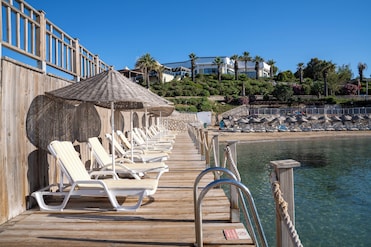 This hotel sits on a sandy private beach. Beach loungers, umbrellas, and towels await sunbathers. Guests can join a lively beach volleyball game.